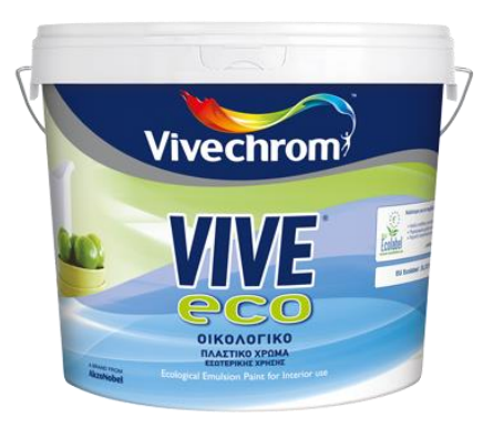 PËRSHKRIMI: VIVE ECO është një bojë plastike ekologjike për përdorim të brendshëm, e përshtatshme për të lyer sipërfaqe si suva, sipërfaqe të patinuara, betoni, plasterboard. Është zgjidhja ekonomike dhe e besueshme për shtëpitë, hotelet, shkollat, spitalet, punët e mëdha publike, duke ofruar një rezultat të garantuar me një çmim të shkëlqyeshëm. Ajo thahet dhe rilyhet shpejt. Kombinon bardhësi dhe mbulim të madh. Ka aplikim të lehtë, shtrirje shumë të mirë dhe pranon dhe larje të lehta. VIVE ECO është në dispozicion në ngjyrë të bardhë dhe në një numër të pakufizuar ngjyrash përmes sistemit Vivechrom CHROMOSYNTHESES.